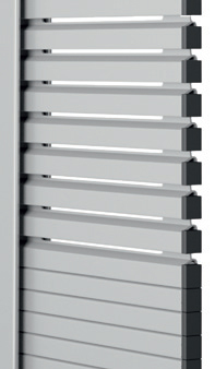 • Extruded aluminium slat Visiolux, with possibilities to roll up inwards or outwards, thanks to its special design perforations permits complete visibility from the inside, blocking direct sunlight when the angle of the sun surpasses 18º. Its innovative aesthetics, with a mere 10 mm total coverage, and its smart design, facilitate integration into modern and up-to-date architectural spaces. In spite of the apparent weakness of the slats, they present maximum wind-charge resistance, which turns it into solid and secure choice.